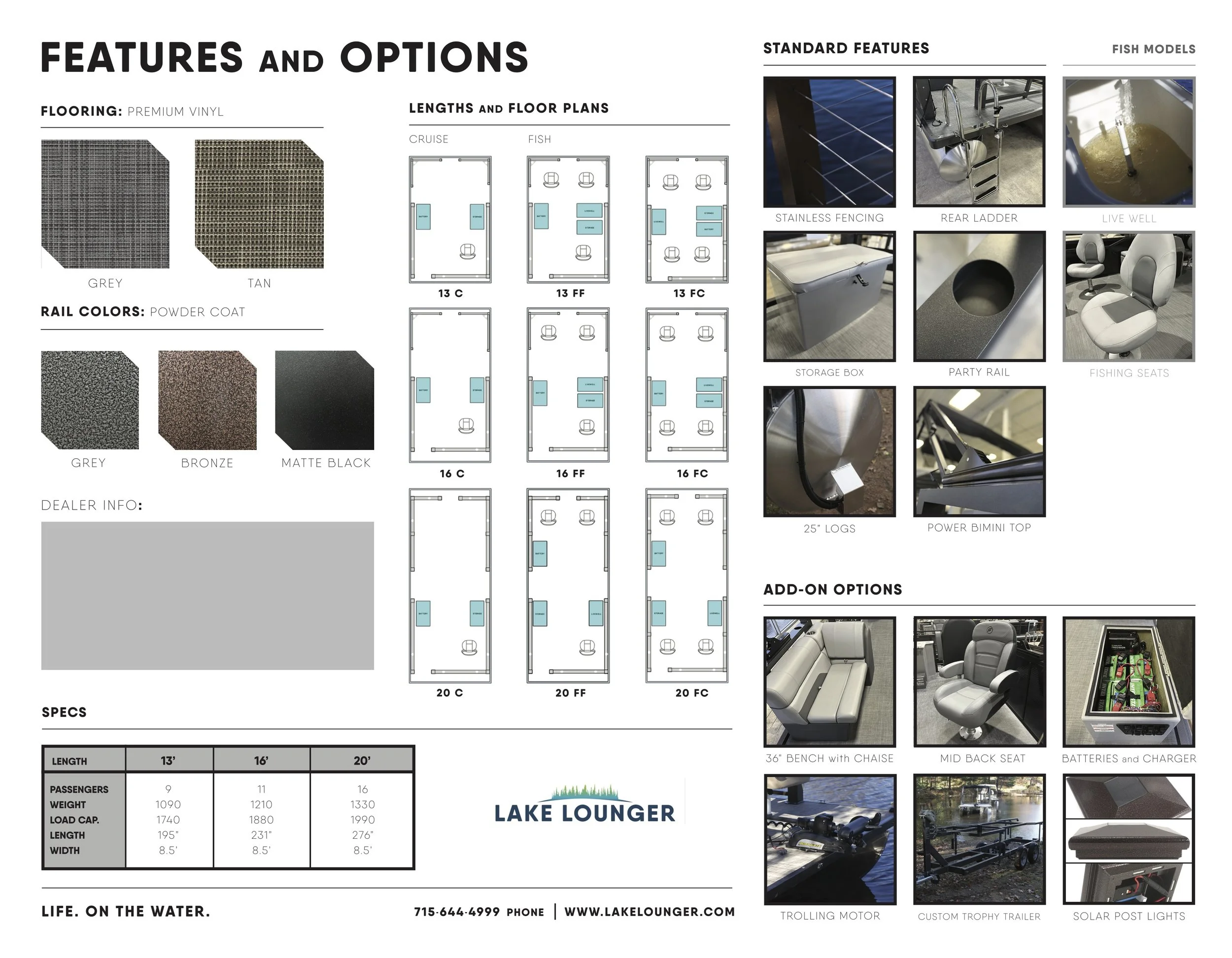Over the course of our storied history in the marine industry, we heard from more and more people who wanted an easier way to relax on the water and enjoy their water views without the hassle of cramped dock space or freeing their boat from a lift or cover. Lake Lounger became the solution to increase dock real estate while fast becoming a popular entry point into pontooning with the addition of an eco-friendly electric trolling motor or an outboard motor. We offer a variety of models that are cost-effective with functional spaces and family-friendly capacities. However you choose to set up your Lake Lounger, we want to help you spend more time enjoying life on the water.